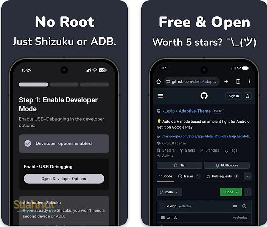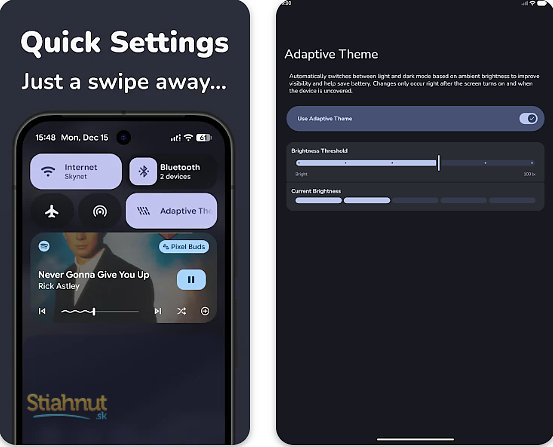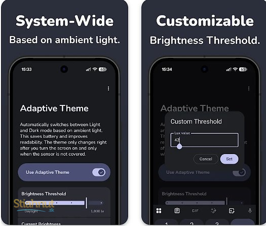 Na rozdiel od bežného prepínania podľa času Adaptive Theme reaguje na skutočné svetelné podmienky okolo vás. Vďaka tomu je používanie telefónu prirodzenejšie, pohodlnejšie a zároveň šetrnejšie k batérii. Navyše si môžete nastaviť vlastné hodnoty citlivosti, takže aplikácia funguje presne tak, ako vám vyhovuje.