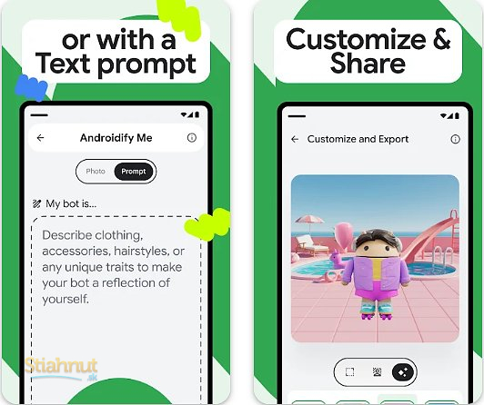 Zelenú Android postavičku iste poznáte. V Aplikáciu Androidify si ju vylepšíte podľa seba a dáte jej tak podobu seba, niekoho z rodinných príslušníkov, priateľov, jednoducho kohokoľvek. Zelenáča naťahujte, zmršťujte, pridajte bradu, zmeňte účes alebo ho vystrojte ako piráta s poriadnym klobúkom a papagájom na ramene. Vytvorené postavy si následne môžete zvoliť ako svoj  profilový obrázok alebo svojich kontaktov v telefóne atď. Zdieľajte svoje výtvory s priateľmi a hlavne sa bavte!