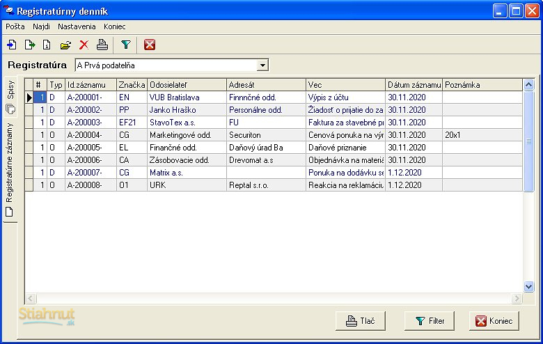 Registratúrny denník je jednoduchým pomocníkom pri evidovaní vašej došlej a odoslanej pošty. Sprehľadní vašu prácu rychlým a efektívnym vyhľadávaním v registratúrnych záznamoch a spisoch, či vytvorením výstupov pre tlač.
